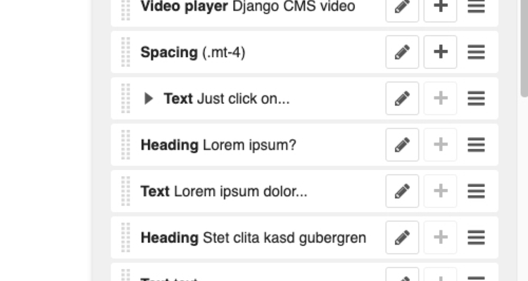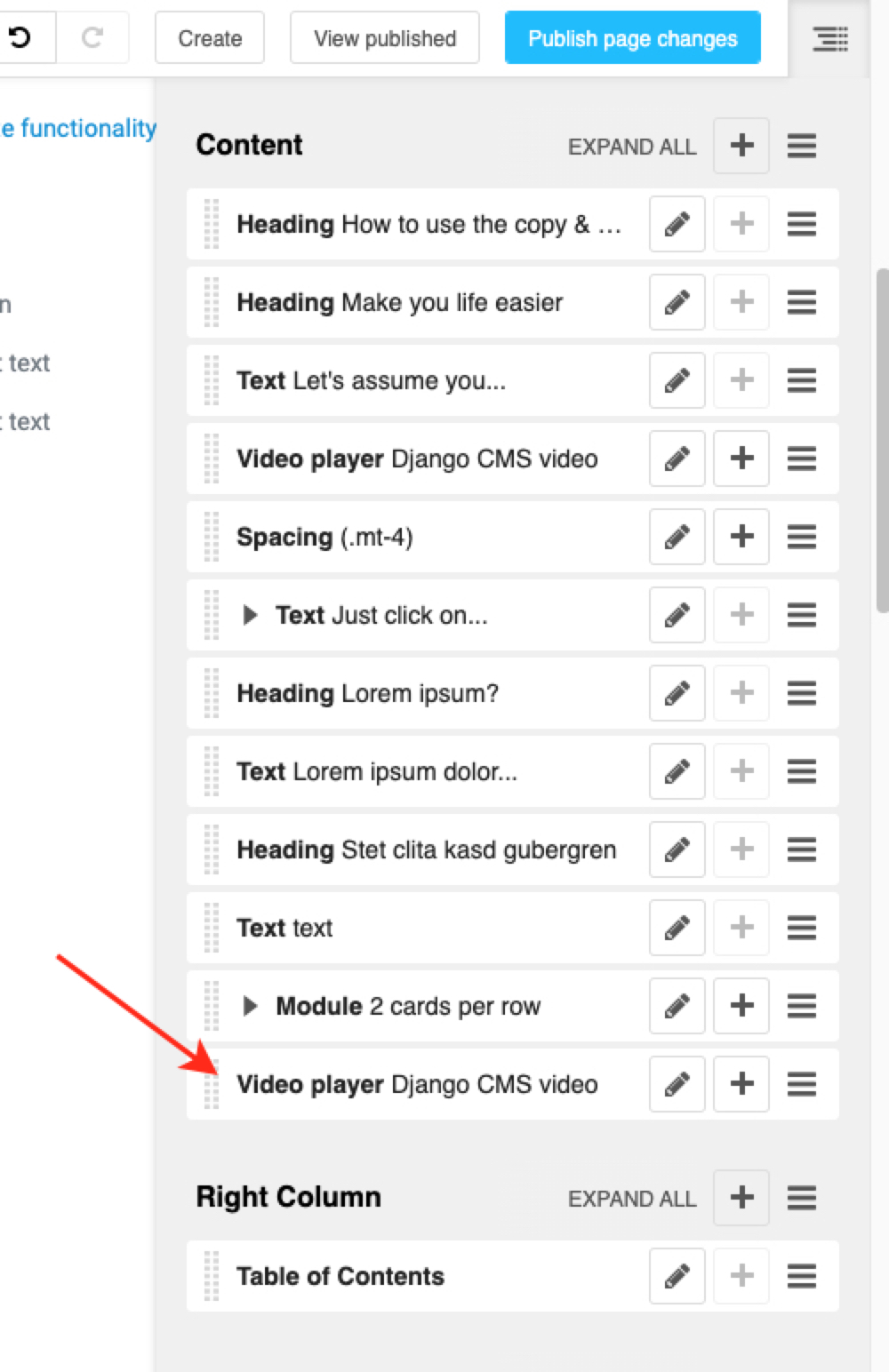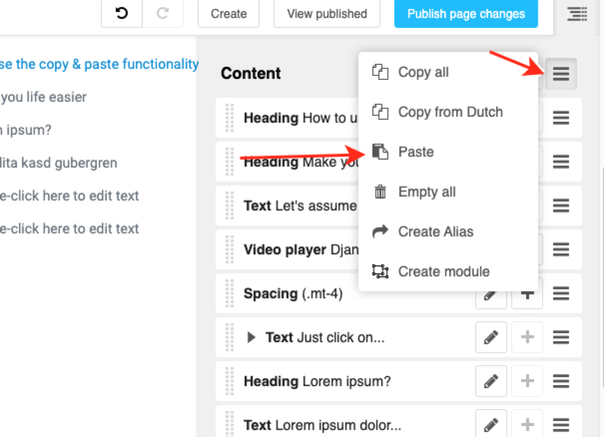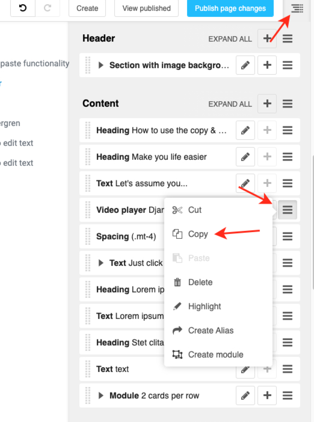 Just click on the menu button in the top right corner to open up the section sidebar. Move your cursor to the Video player plugin and click on the menu toggle icon (or as we like to say ). Select Copy and click on the hamburger button next to the Content section.