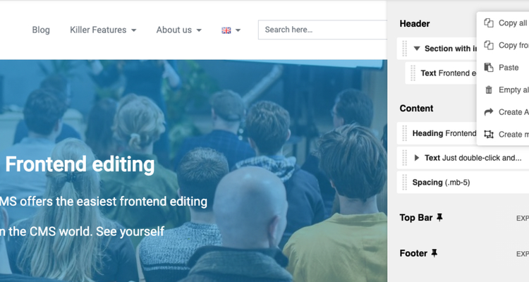In our example we copy the entire header from the frontend editing page