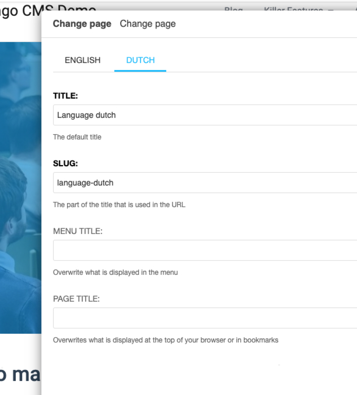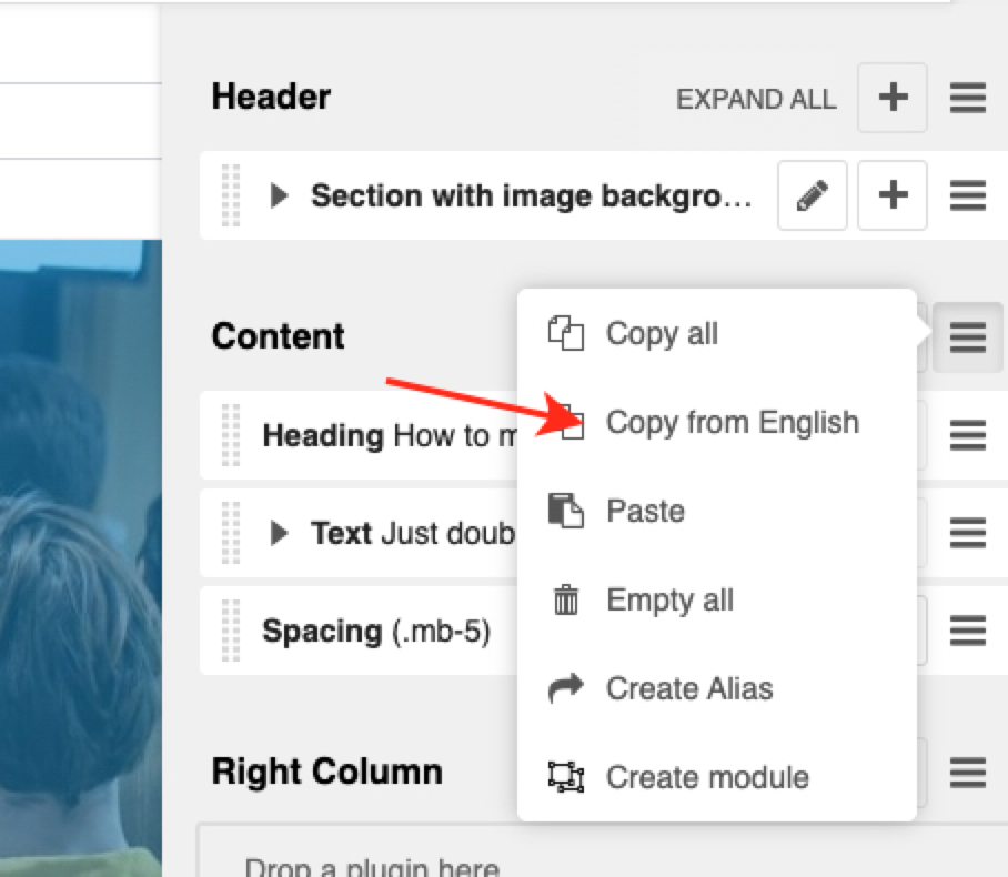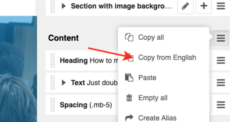 Let's say you are building a website in two languages, English and Dutch. After you have build the English pages, you can easily copy the entire content to the dutch page. Go to Language and click on Copy all plugins. You then only need to translate and insert the content.